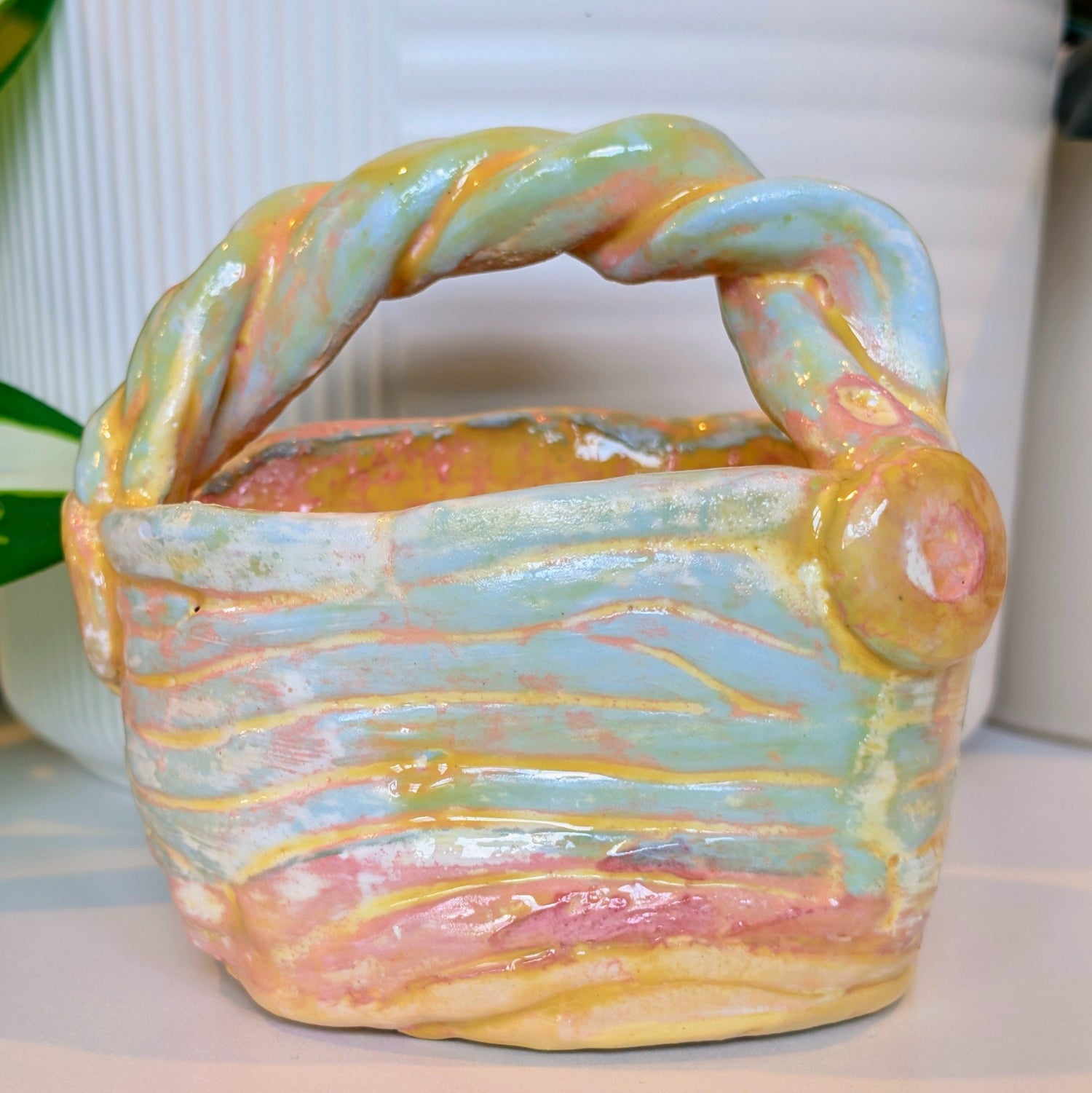 A pastel clay basket with soft, muted tones, smooth, simple, and quietly charming, like something made for gentle mornings and calm corners.