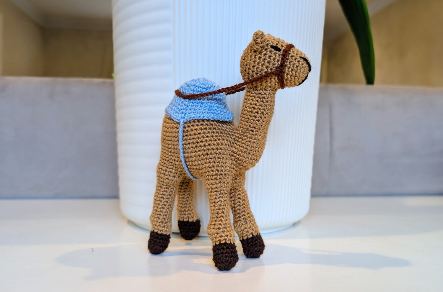 A laid-back crocheted camel with a gentle smile, calm, quirky, and clearly convinced every day should be a slow stroll through the desert.
