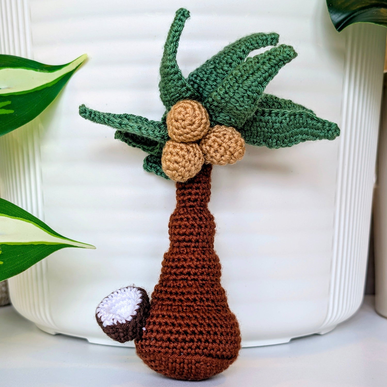 A crocheted coconut tree topped with plump little coconuts, relaxed, tropical, and carrying that slow island-day rhythm.