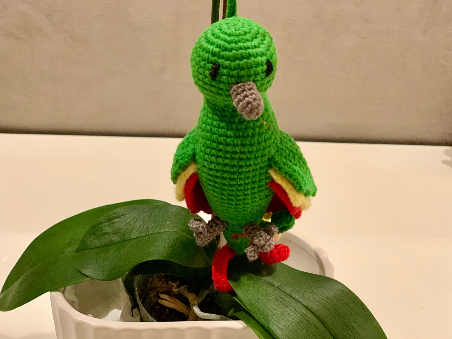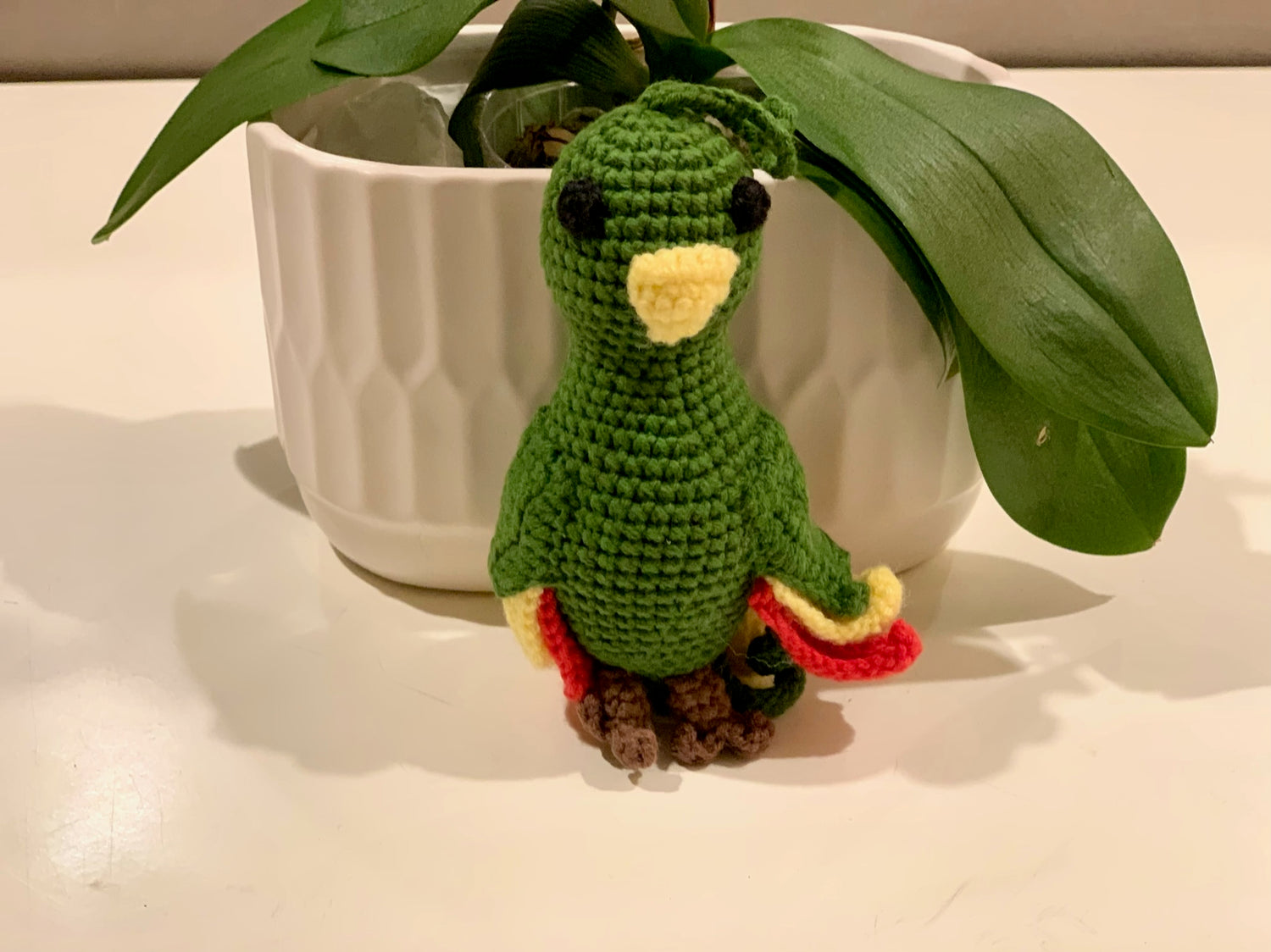 With colorful crocheted feathers, don’t be surprised if this parrot wants to chat as he’s perched high upon the shelf.