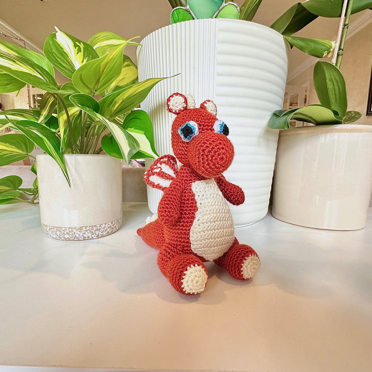 This colorful sitting dragon makes a perfect gift with its playful scales and wings. Comes in various shades of blue, red-brown, and orange with yellow accents.