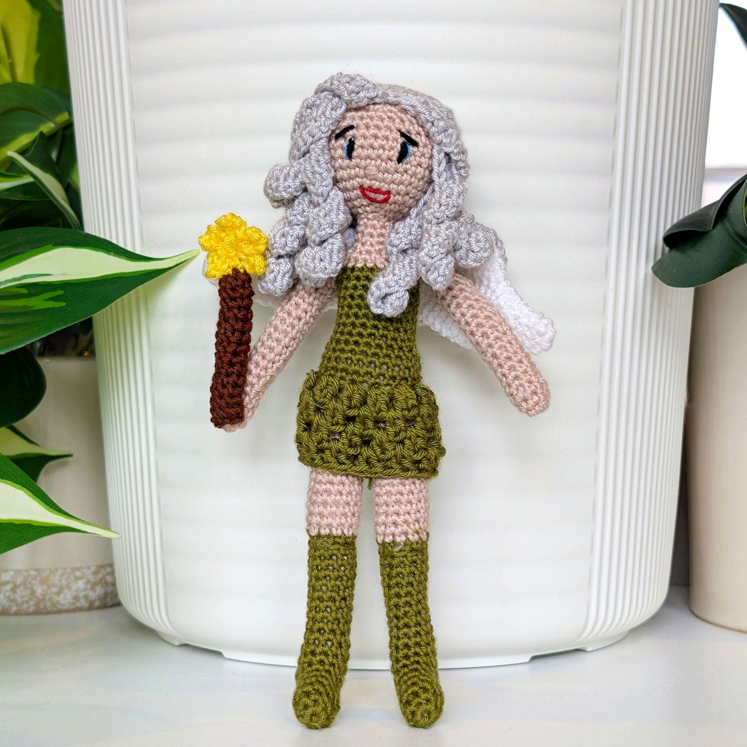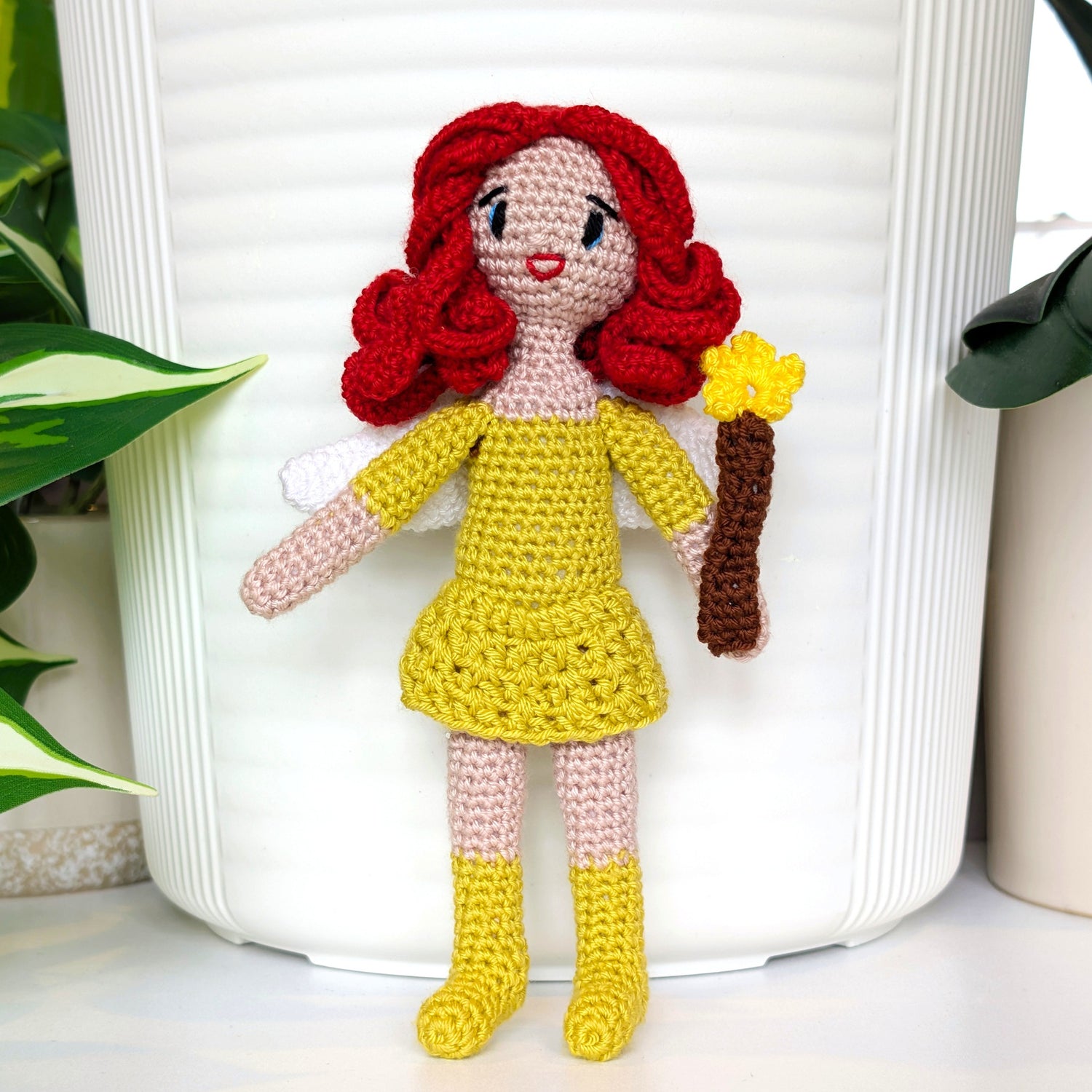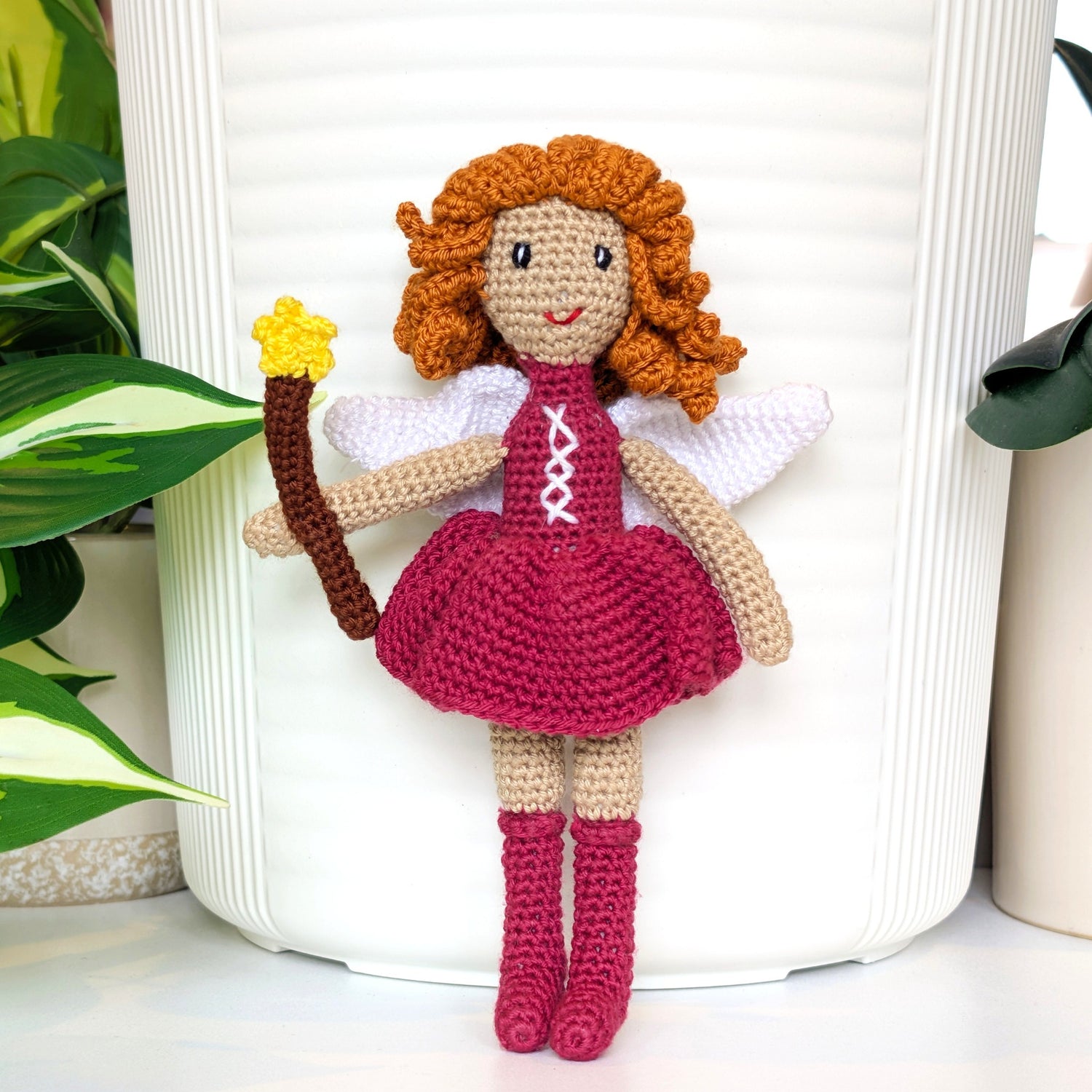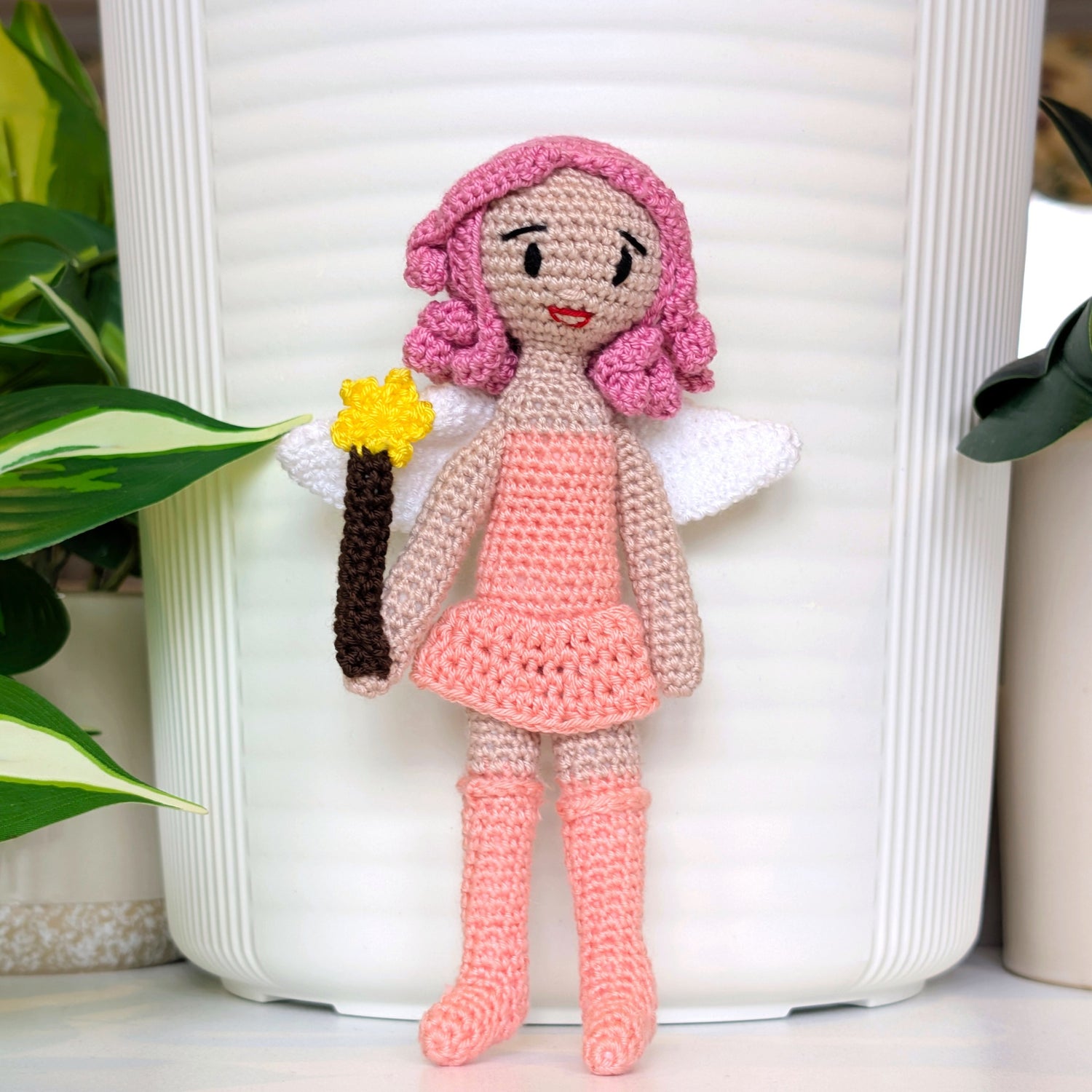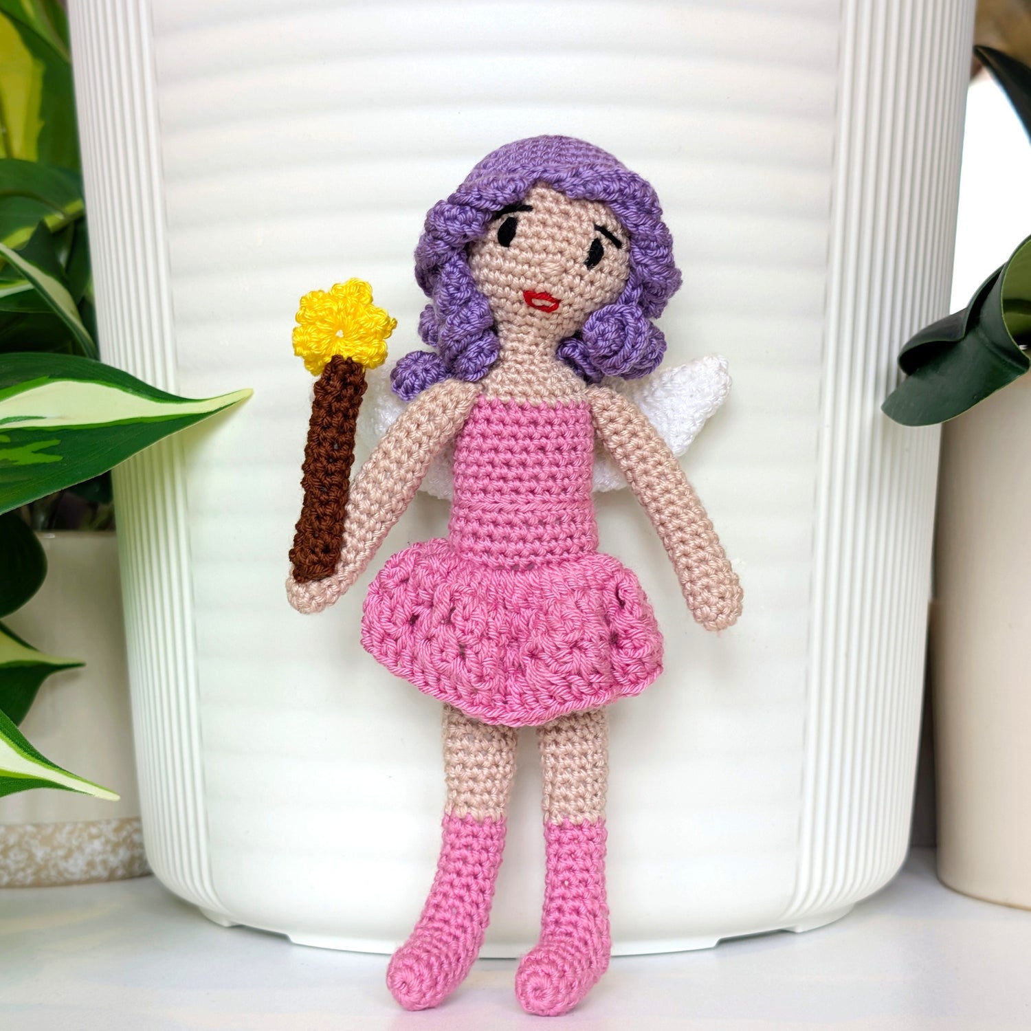 A crocheted fairy with a wand in hand, delicate wings behind her, and high-knee stockings that add a playful twist, and ready to cast her own kind of magic.