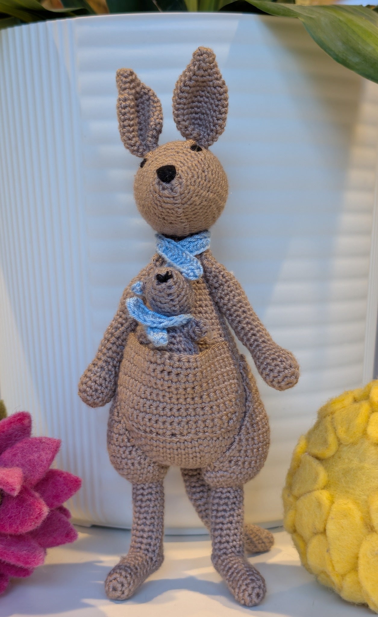 A cozy duo of kangaroos, mama and joey, each wrapped in their own colorful scarf, ready for cuddles.