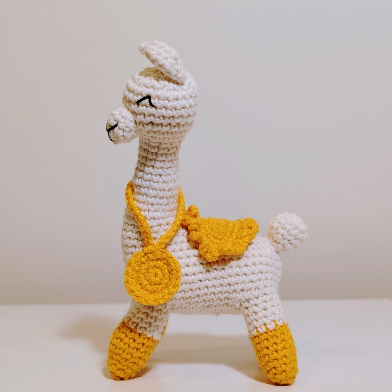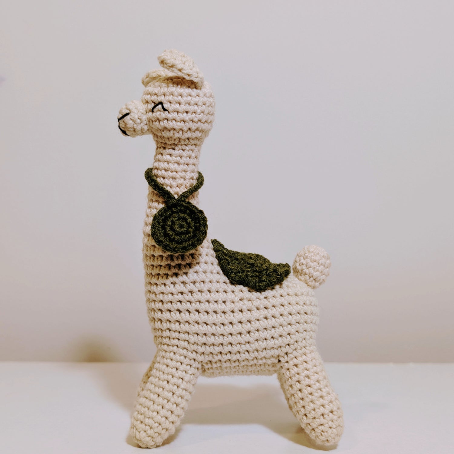 A crocheted llama with medallion, looking proud, whimsical, and ready to parade its charm through the mountains. Start collecting your refugee-made llamas today.