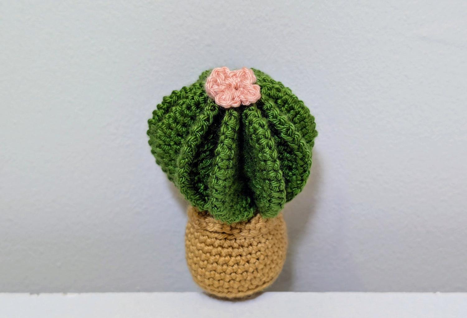A cheerful crocheted cactus sitting snug in its pot, topped with a blooming flower low maintenance, high charm, and guaranteed to brighten any spot without needing a drop of water.