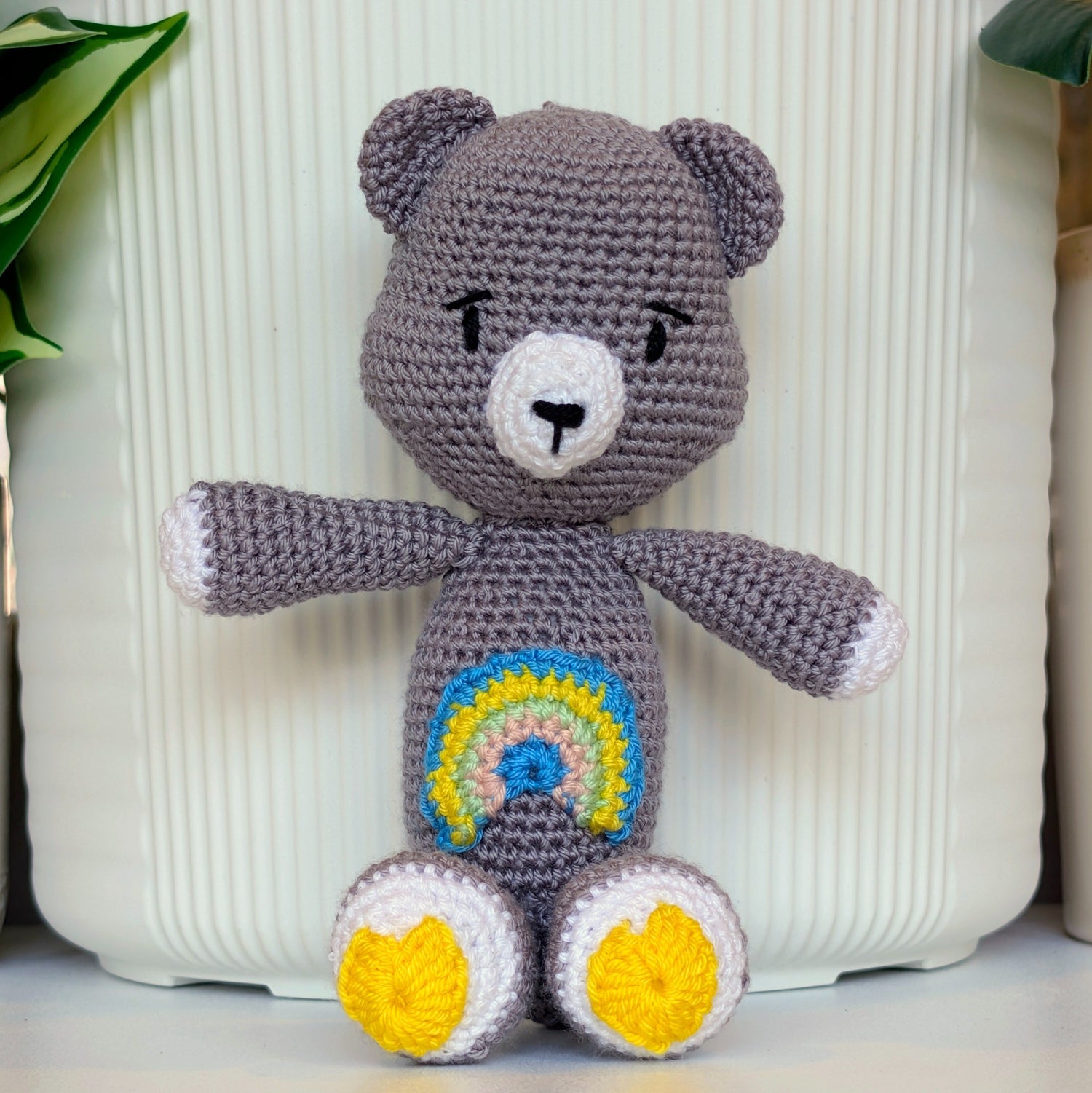 One in a series of character bears, this refugee-made plush bear with a rainbow on his belly beams happiness. Find your favorite character bear.