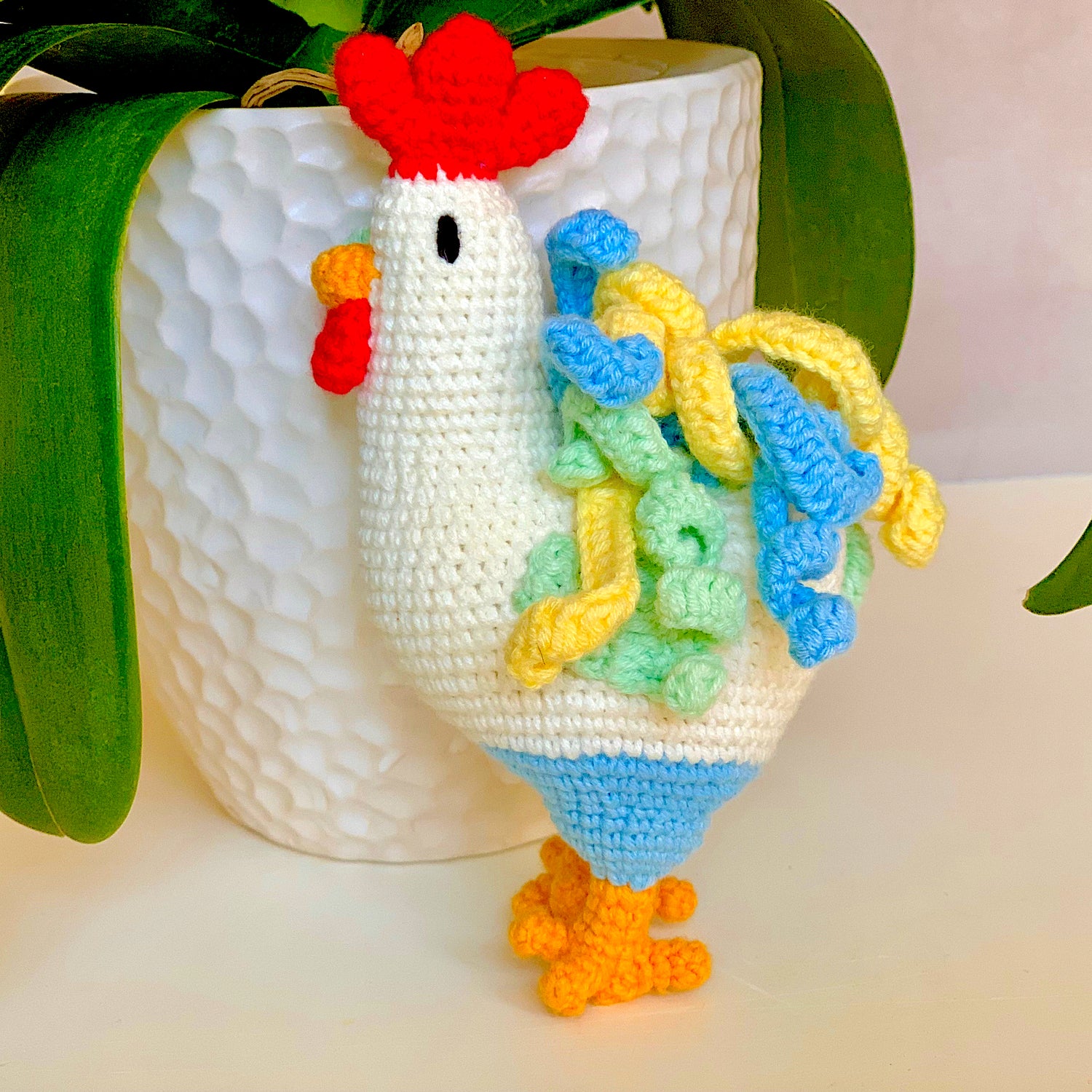 Crowing with the sunrise, this crocheted rooster greets you first thing in the morning with your cup of coffee. This bestseller is lovingly referred to as the "chicken in pants."